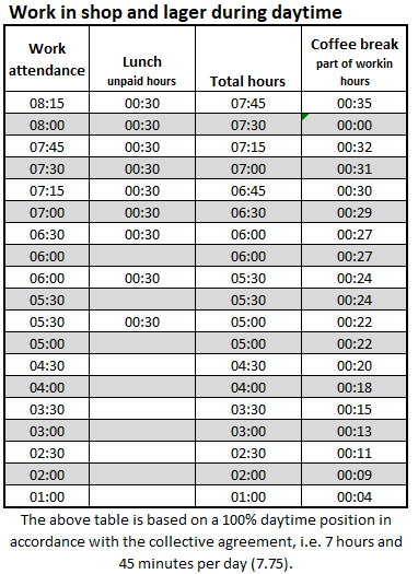 Coffee breaks may be shortened or omitted by agreement at the workplace. In such cases, working hours shall be reduced accordingly, without any reduction in wages.Those who work part-time are entitled to a proportional coffee break.Below is a table showing staff presence during shop assistants' daytime working hours and their entitlement to coffee breaks.