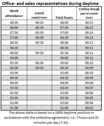 Those who work part-time are entitled to a proportional coffee break.Below is a table showing the daytime working hours of office and sales staff and their entitlement to breaks.